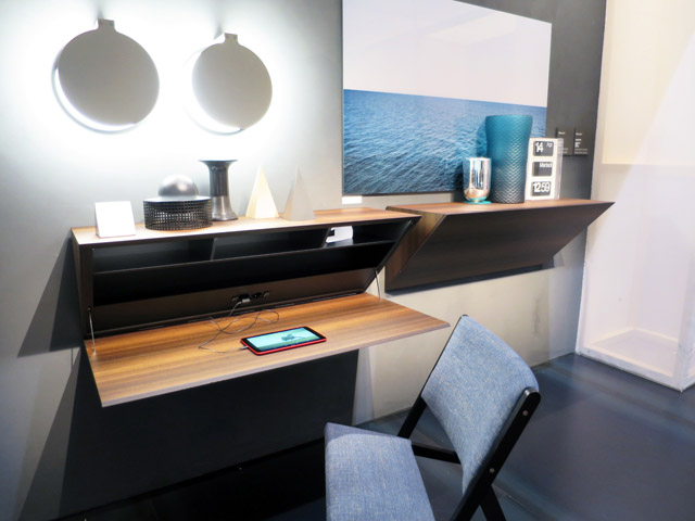 Zřejmě stále dostatečně neprobádanou a nevytěženou problematikou jsou usně. Ty z oblasti sedacího nábytku pronikají i do prostoru psacích ploch pracovních stolů, případně dokonce do úložného nábytku. Nápadité řešení prostříhané usně, která vypadala z dálky jako krajka, bylo posledním bonbonkem mé návštěvy letošního Milána.