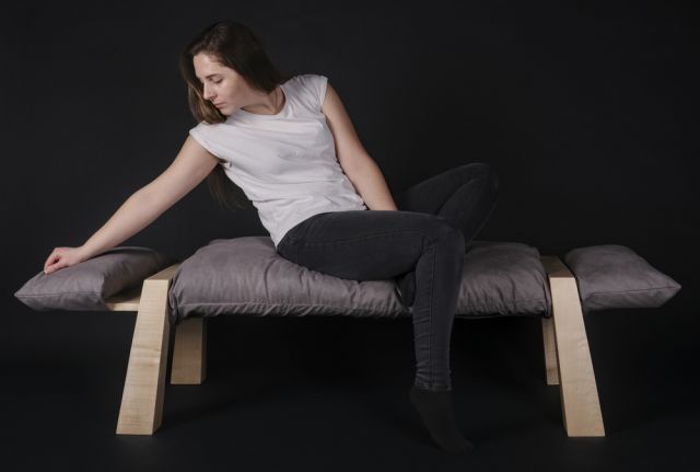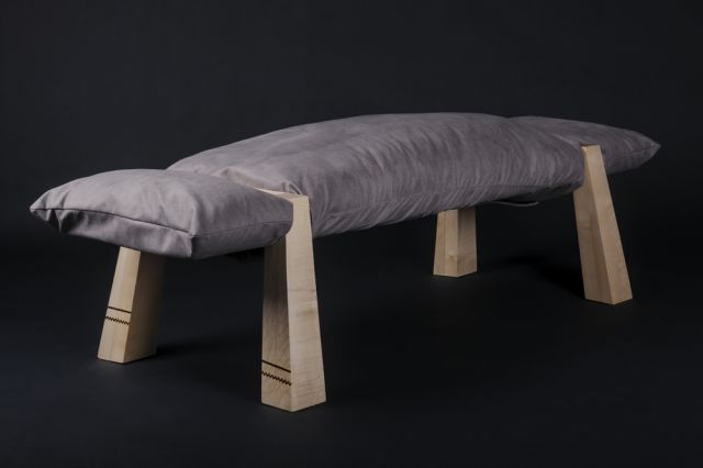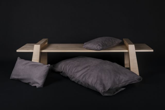 Javorové drevo sa zdala byť dobrá voľba najmä pre nízku hmotnosť a tvrdosť dreva, aj keď sa to nezdá, lavica je ľahká (zvládne ju odniesť aj jeden človek sám). Z môjho pohľadu ako autora, voľné čalúnenie, to jest odnímateľné, má viacero výhod. Užívateľ môže využiť lavicu bez čalúnenia/ čiastočne čalúnenú/ celočalúnenú. Prakticky, „vyzlečiem“ z lavice jeden bočný vankúš a zrazu mám vedľa seba rovnú drevenú plochu, ktorá mi môže slúžiť ako stolík – na položenie hrnčeka s kávou. :) Alebo tieto vankúše využijem ako podnož či na opretie chrbta, pokiaľ sa lavica nachádza pri stene. Zároveň sa tým lavica stáva odlišná a prináša jej to istú výnimočnosť. To, čo ma viedlo k tomuto riešeniu však na začiatku nebola táto praktická stránka, ktorú som práve opísala. Ale pramenilo to z mojej inšpirácie – kozy na pílenie dreva. Drevená konštrukcia pre mňa predstavovala samotnú kozu ako pomôcku a čalúnenie zasa poleno, ktoré idem narezať. Preto je čalúnenie rozdelené na tri kusy – človek rozpílil poleno, a preto sa dá odnímať – odnášam narezané kusy.
