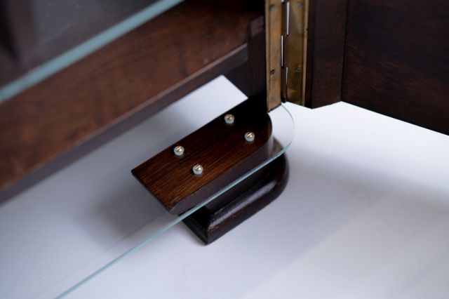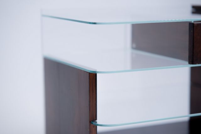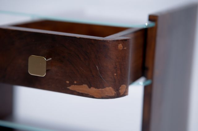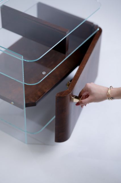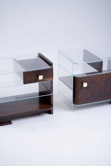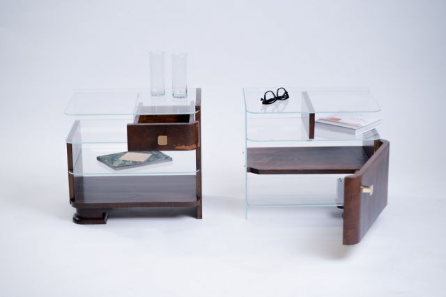 Kolekce se skládá ze dvou nočních stolků, které vznikly rozdělením jednoho původního starého stolku ve stylu art deco. Každý z nich využívá jiné části, přičemž se jednotlivé prvky v páru neopakují. Hlavním materiálem je dřevo z původního nočního stolku, ke kterému jsem dodala nové prvky jako je float čiré sklo, mosazné vruty a mosazné knopky.