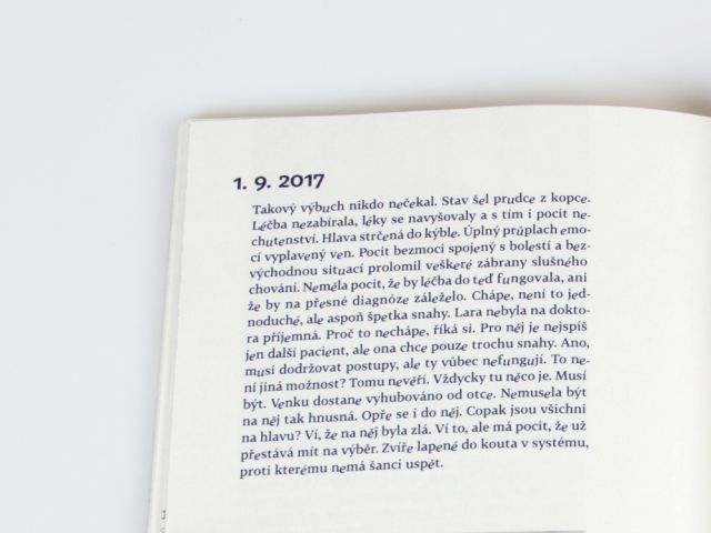 Většina designérů se snaží vytvořit sazbu co nejvíc uživatelsky příjemnou. Můj záměr je přesně opačný. Chtěla jsem metaforicky přenést nežádoucí vedlejší účinky onemocnění do knihy, aby si každý čtenář vyzkoušel, jak otravné to je. Protože nemůžu stát u každého člověka a jehlou ho píchat do ruky, rozpad sazby byla ideální možnost, jak čtení znepříjemnit. Písmenka jsou otočná, v kurzívě, nebo chybí úplně a padají z knihy ven. Rozpad není náhodný, ale zrcadlí se v něm můj eskalujicí zdravotní stav. Dále je text rozdělen na dvě části, které jsem potřebovala od sebe rozlišit. Tou první je popis minulosti z pohledu dítěte, která je psaná v er-formě. Vyznačena je modrou barvou, která symbolizuje problémy s cirkulací krve v končetinách. Končetiny mám věčně ledové, a tudíž namodralé. Druhá část je současnost, kde v ich-formě popisuji, co se stalo ode dne, kdy jsem knihu začala psát a je v rudé barvě, která symbolizuje zánět v kloubu a otok. Třetí část jsou přepsané lékařské zprávy, které jsem se snažila co nejvíc nasimulovat za pomocí neproporcionálního písma, které se používalo v psacích strojích.