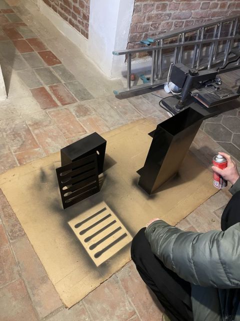 Materiálem by byl žáruvzdorný plech. Vznikl 1:1 prototyp ze MDF desky, který jsem pak nasprejovala na černo, abych měla jasnou představu a samozřejmě 3D model a hromada skic.