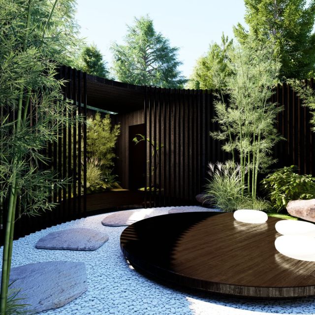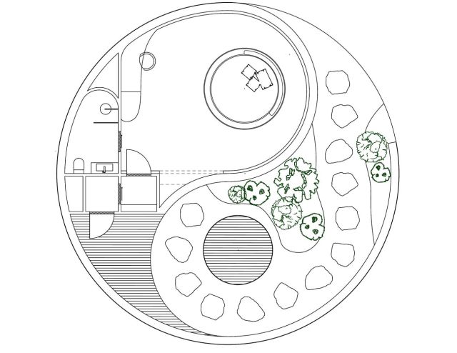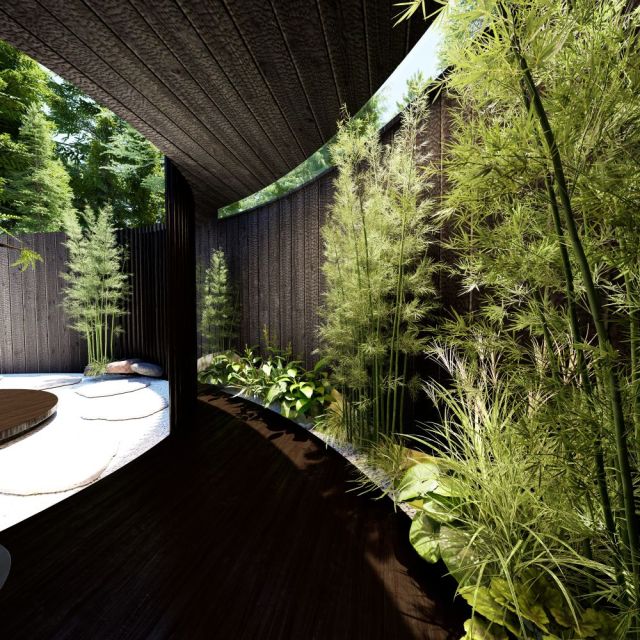 Komplex je rozdělen na meditační zahradu a prostor pro terapii, inspirované tvarem Jin a Jang – symbolizující dvě protikladné, ale doplňující se síly. Stěny se směrem k východu zmenšují a mizí, čímž symbolizují plynulý přechod mezi terapií a „normálním světem“. Jsou obloženy spáleným dřevem metodou shou sugi ban, která dodává specifickou patinu, chrání dřevo a podporuje pocit bezpečí.