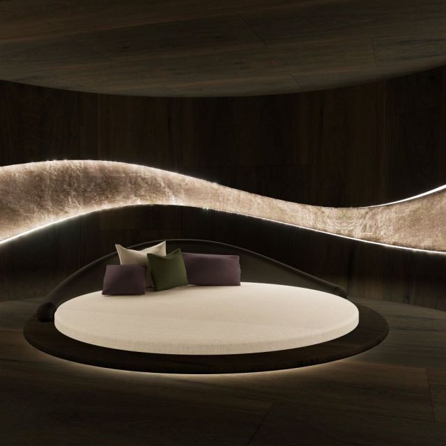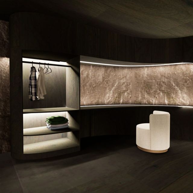 Podél celé stěny, která je obložena surovým kamenem, jsou umístěny dřevěné panely imitující křivku. Aby se předešlo zraněním během pobytu, chtěla jsem co nejvíce eliminovat ostré hrany, proto tyto dřevěné panely postupně přecházejí ve stolovou desku a šatní skříň.