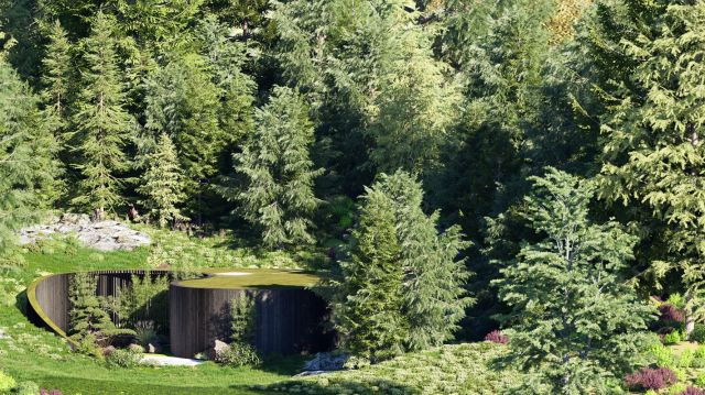 kde se člověku lépe podaří zpomalit. Stromy vytvářejí přírodní izolaci od ruchu okolního světa a mohou vzbuzovat pocit bezpečí a propojení s přírodou. Ačkoliv může komplex působit i samostatně, rozhodla jsem se ho zasadit do skály. Na střechu jsem navícumístila mech, díky čemuž stavba nepůsobí nijak rušivě a přirozeně splývá s okolním prostředím.